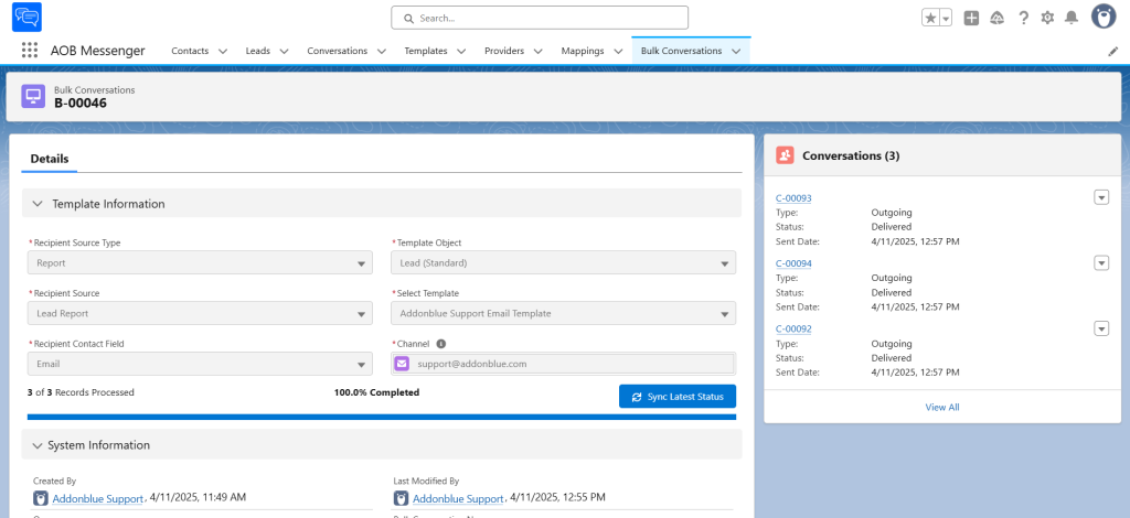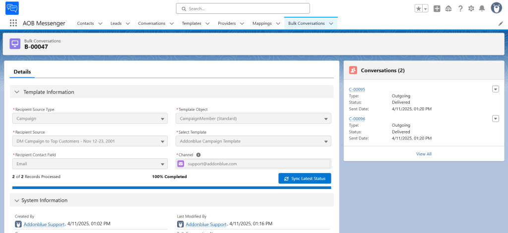 By clicking on the Process button, it will begin the process of sending emails to users with a value in the selected field (email in this case). A progress bar will be displayed to indicate the status of the process. Additionally, a “Sync latest status” button is also available, which the user can press at any time to refresh and view the latest status of the entire process.