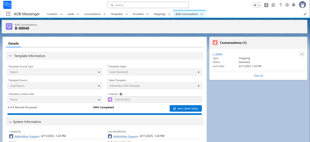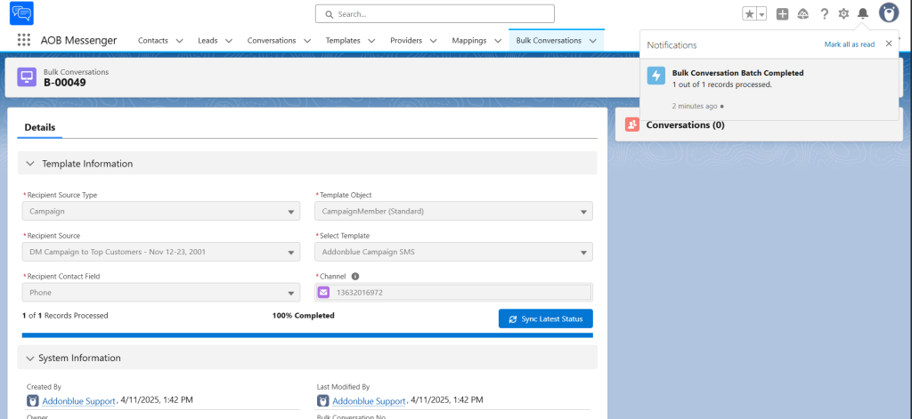 By clicking on the Process button, it will begin the process of sending SMS to users who have a value in the selected field (Phone in this case). A progress bar will be displayed to show the status of the process. Additionally, a “Sync latest status” button is also available, which the user can press at any time to refresh and view the latest status of the entire process.